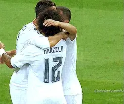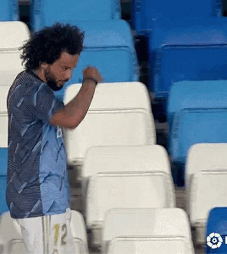 Marcelo Vieira, wearing his Real Madrid jersey, salutes from the stands at a LaLiga match.