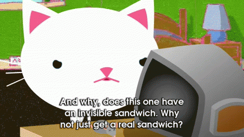 A cartoon cat questions why someone has an invisible sandwich and suggests getting a real one instead.