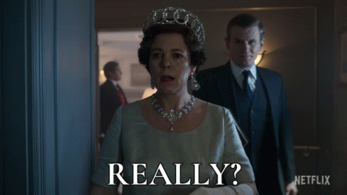Queen Elizabeth II (Olivia Colman) looks surprised, asking "Really?", with Martin Charteris (Charles Edwards) behind her.