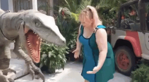 Rebel Wilson reacts dramatically to a large dinosaur statue, playfully showing fear and panic.