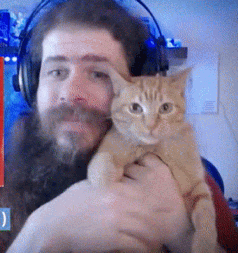 A man with headphones holds an orange cat, both reacting with open mouths, expressing approval.