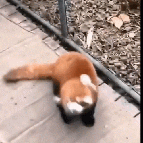 A red panda walks on a paved path, briefly standing on its hind legs before continuing its stroll.