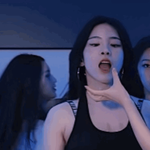 A member of Red Rederadiva, possibly Hu Jingyi or Li Yulin, makes a fierce expression in a black tank top.