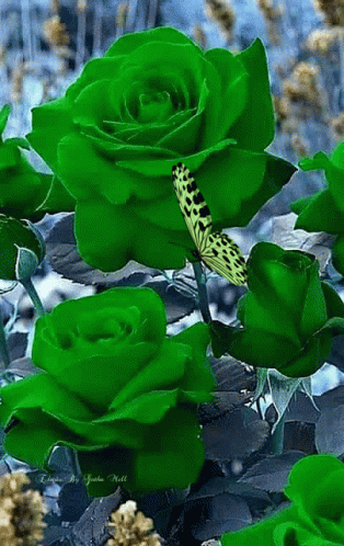 A beautiful yellow butterfly with black spots rests gently on a vibrant green rose in a garden.