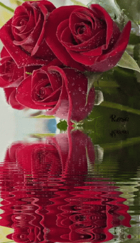 Vibrant red roses with water droplets, beautifully reflected in rippling water, creating a serene scene.