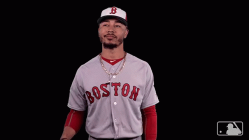 Mookie Betts, wearing a Boston Red Sox jersey and cap, points upwards with a confident expression.