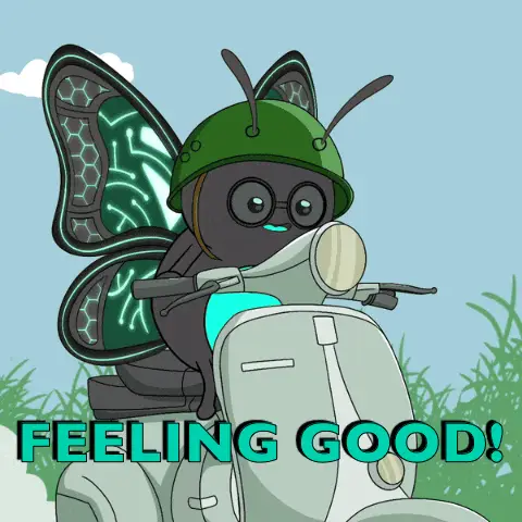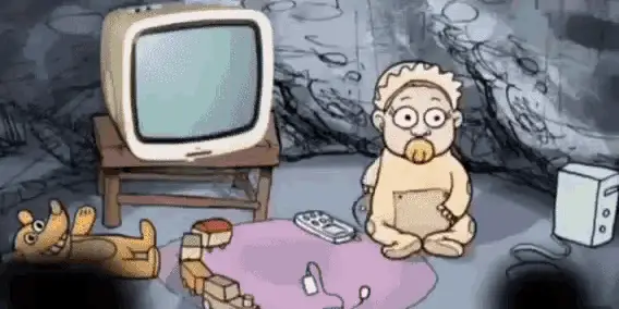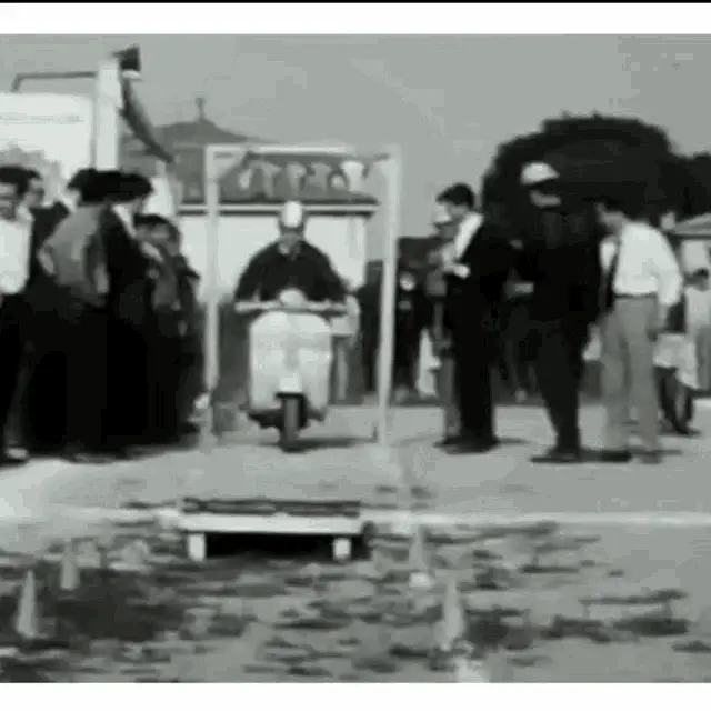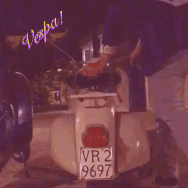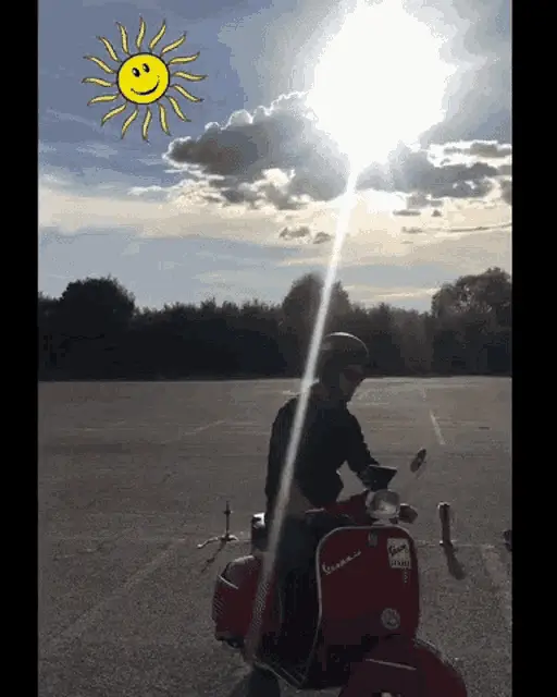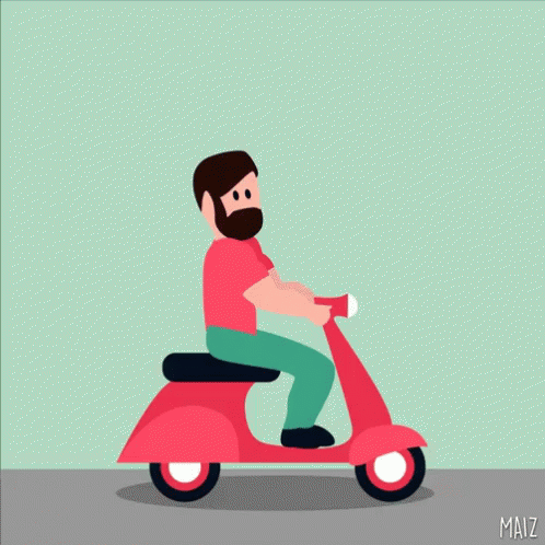 A cartoon man with a beard rides a red Vespa scooter past iconic London landmarks in this animated clip.