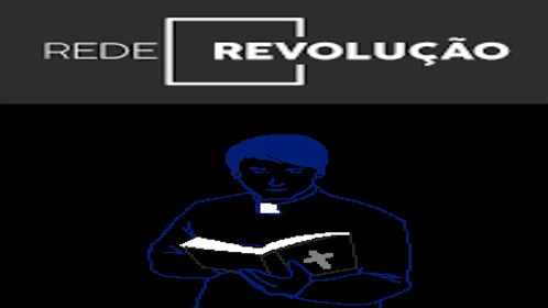 A stylized drawing of a priest reading a bible, featuring the 'Rede Revolução' and 'Faith Unholy Trinity' themes.