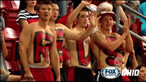 Shirtless Reds fans with 'RED' body paint cheering enthusiastically at a game, captured by FOX Sports Ohio.