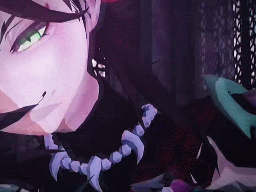 A close-up of Redxiao from Genshin Impact, featuring his distinctive green eyes and a necklace of teeth.