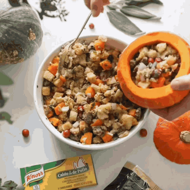 Preparing a delicious pumpkin stuffing recipe with Reese Specialty Foods ingredients, perfect for a festive meal.