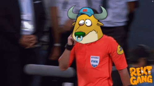 Rekt Bull referee making VAR check gestures during a football match, wearing a red FIFA shirt.