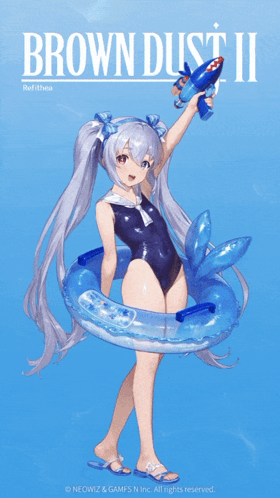 Refithea from Brown Dust II in her summer swimsuit, holding a water gun and floating in a bubble.