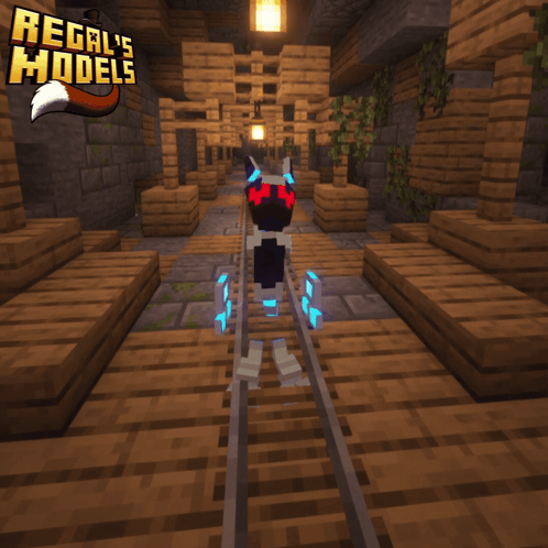 A cute robot character from Regal's Models in a Minecraft mine shaft, wagging its tail.