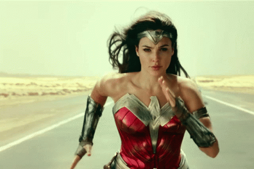 Gal Gadot as Wonder Woman runs powerfully down a desert road, her hair flowing in the wind.