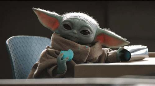 Baby Yoda, also known as Grogu from The Mandalorian, sits at a table, holding and eating a blue cookie.