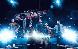 CNCO performs a lively reggaeton dance on stage with bright lights and a race car prop.