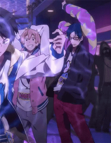 Anime characters Rei and Nagisa dancing and partying in a vibrant setting.