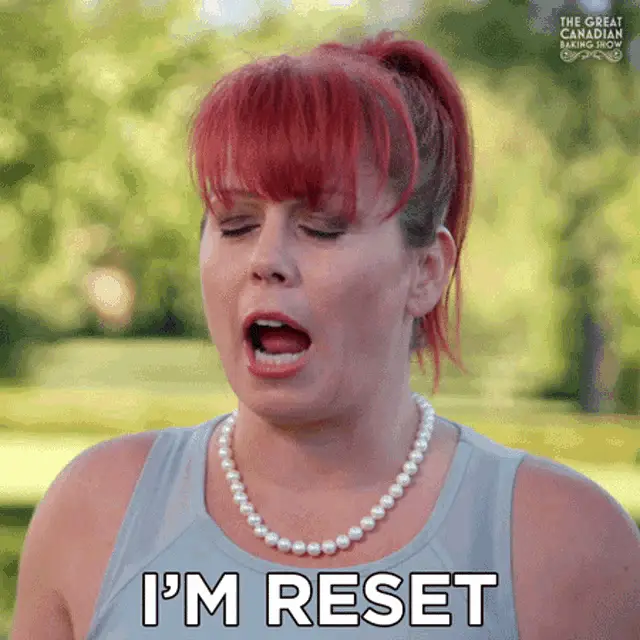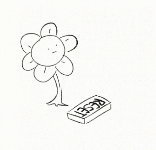A black and white drawing featuring a flower with a face alongside a prominent reset button.