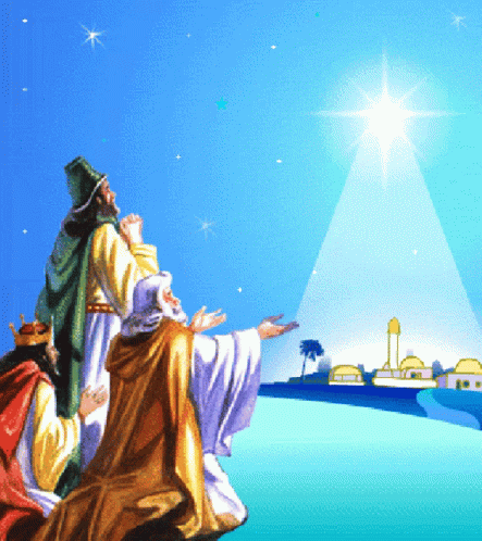 A painting depicting the Reis Magos, or Three Wise Men, looking up at a bright, sparkling star.