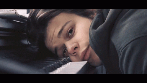 Reka I Reka rests their head on a piano keyboard, appearing tired or sleeping in a close-up shot.
