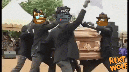 Rekt Wolf characters perform the iconic Coffin Dance meme, featuring Crypto NFT themes and dancing pallbearers.