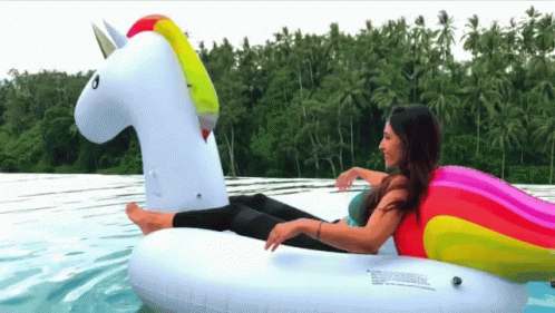 Susana Yabar relaxing on a unicorn inflatable float in tropical waters with palm trees in the background.