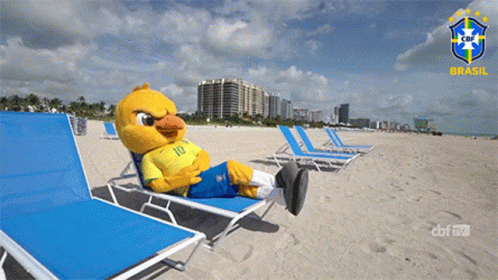 The Brazilian national football team mascot, Canarinho, relaxing on a beach chair by the ocean with a city skyline.