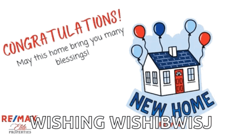 RE/MAX Elite Properties congratulates on a new home with a card featuring a house, balloons, and blessings.