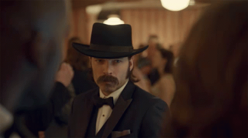 Doc Holliday tips his hat at a formal party, with the message #BringWynonnaHome visible in the background.