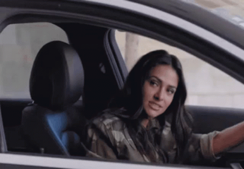 Renata Notni as Adela, driving a car and looking intently, from the series El Dragon.