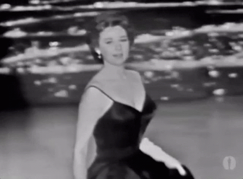 Renée Slater performs an elegant dance on stage, wearing a black dress and white gloves.