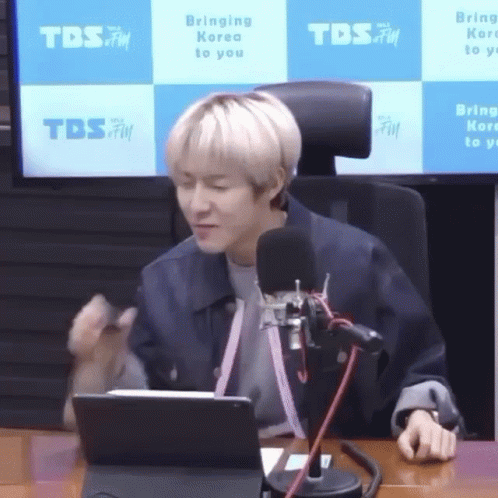NCT's Renjun passionately singing a high note into a microphone during a broadcast.