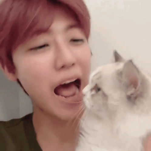 Rennjuns Jaemin playfully pretends to 'eat' the cat Luna, holding her close to his open mouth in a moment of cute aggression.
