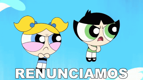 Bubbles and Buttercup from The Powerpuff Girls look angry and declare 'We resign' in this animated scene.