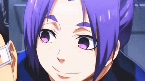 Blue Lock's Reo Mikage, an anime boy with purple hair, smiles happily directly at the camera.