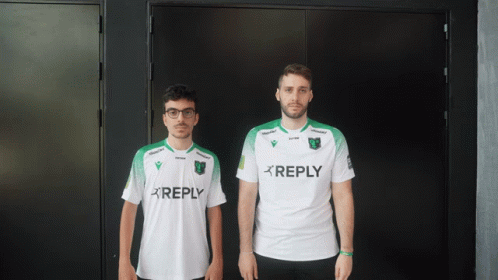 Two men in Reply Totem TTM shirts pose for the camera, one pointing and the other saluting.