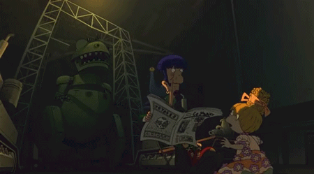 Angelica Pickles and Jean-Claude react to a 'Totally Disastrous' headline with Reptar in Rugrats in Paris.