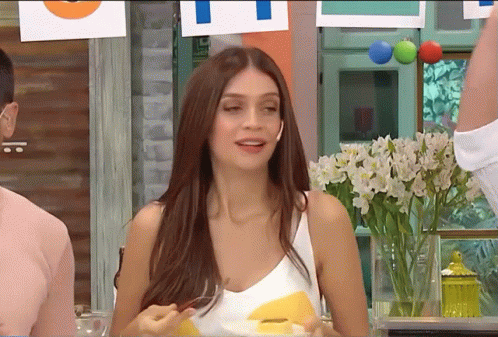 Zaira Nara takes a deep breath and sighs on a TV show set, wearing a white and yellow top.