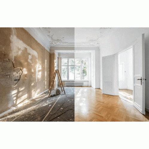 Witness the dramatic before and after transformation of a room undergoing restoration, from damaged walls to a pristine finish.