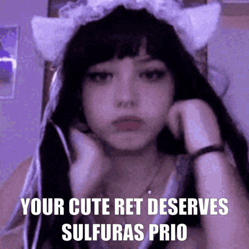An egirl with cat ears and a purple filter, featuring the meme text 'YOUR CUTE RET DESERVES SULFURAS PRIO'.