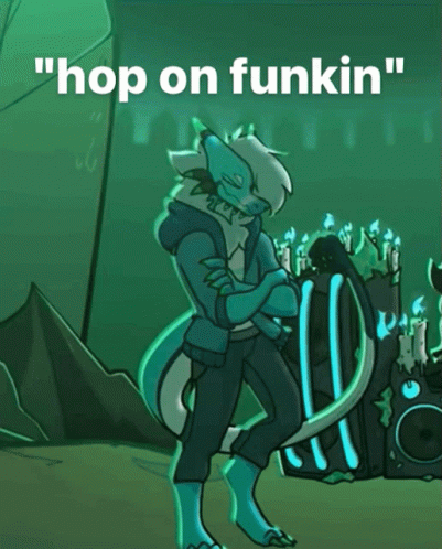 Animated character Monovy from Retrospecter with the text "hop on funkin" displayed above.