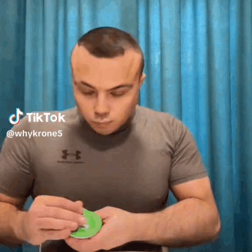 Reven, a man in a grey shirt, eats shrimp from a small cup in this TikTok video.
