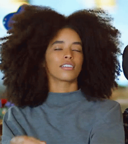 Woman with large afro shows exasperation with a facepalm and rolling eyes gesture, possibly about relationships.