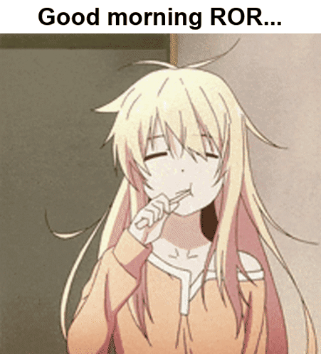An anime girl with blonde hair brushes her teeth, wishing 'Good morning ROR' in a sweet animated scene.