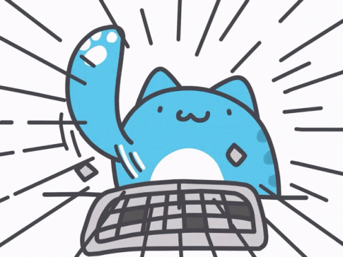 Rexx, the energetic blue cat, enthusiastically types on a keyboard with rays of excitement.