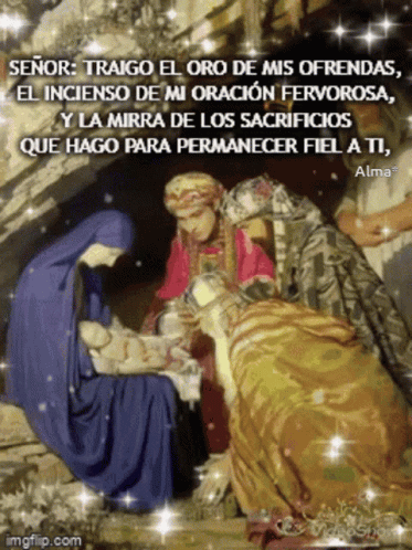 The Three Wise Men present their offerings of gold, frankincense, and myrrh to baby Jesus in a nativity scene, accompanied by a fervent prayer.