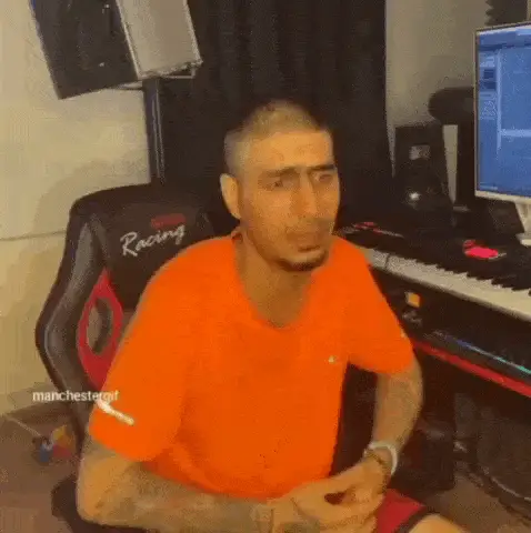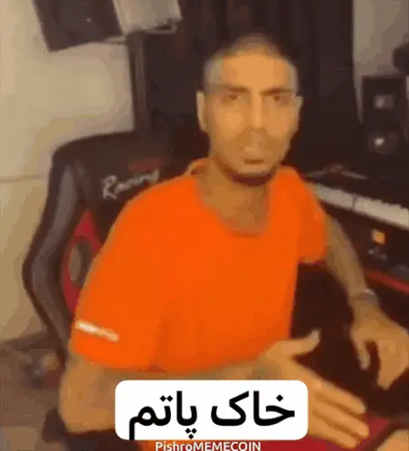 Reza Pishro delivers an intense message in his studio, expressing frustration with his outstretched hands.
