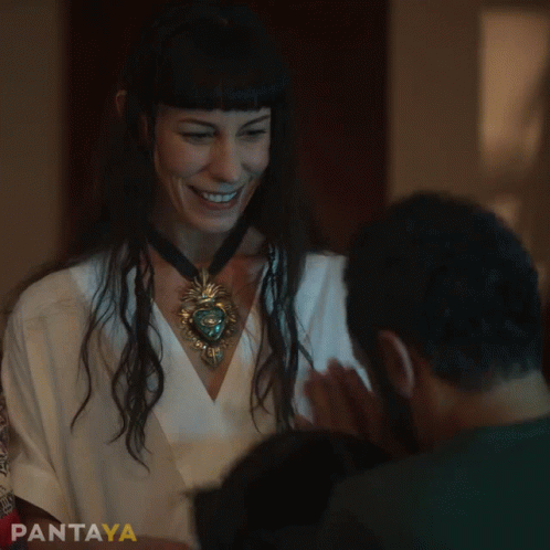 A woman smiles as Óscar (Humberto Busto) prays, wearing a heart necklace, from El Juego De Las Llaves.