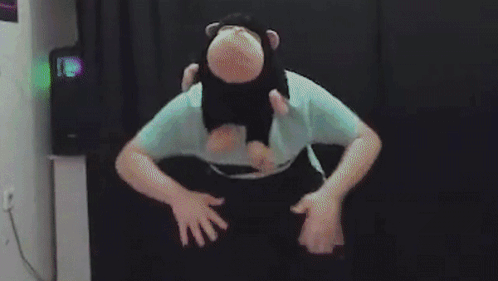 DS Orhan dances energetically in a monkey costume, illuminated by dynamic RGB lighting in a room.
